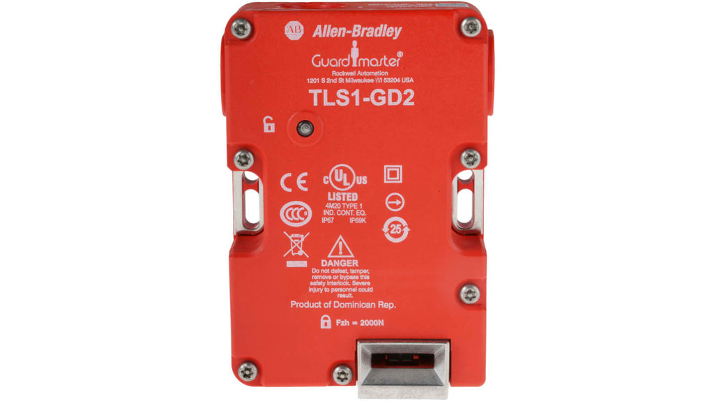 Interruttore di interblocco a solenoide Allen Bradley, modello 440G-T27121, tensione di alimentazione 24V ca/cc, grado di protezione IP67, contatti di sicurezza 2NC, contatto ausiliario 1NO, ingresso cavo M20, dimensioni 126mm x 86mm x 33mm, temperatura di esercizio da -20 a +60 gradi Celsius, materiale custodia in plastica rinforzata, conforme a norme EN954-1, ISO13849-1, IEC/EN60204-1, certificazione CE, approvazione UL.
