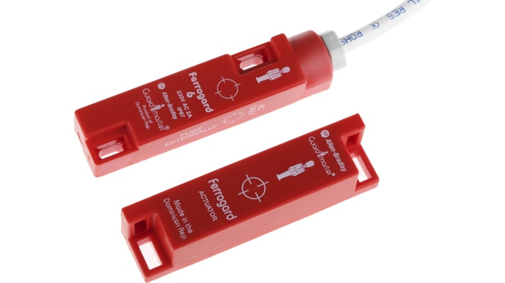Interruttore di sicurezza magnetico senza contatto, tensione 250V ca, corrente 2A, contatti di sicurezza NC, custodia in plastica ABS, cavo da 2 m, attuatore magnetico incluso, distanza di commutazione 12 mm, grado di protezione IP67, temperatura operativa -10 a 65 gradi Celsius, conforme a EN954-1, ISO13849-1, IEC/EN60204-1, certificazione CE, registrazione UL. Dimensioni: 84 mm x 19 mm x 16 mm.