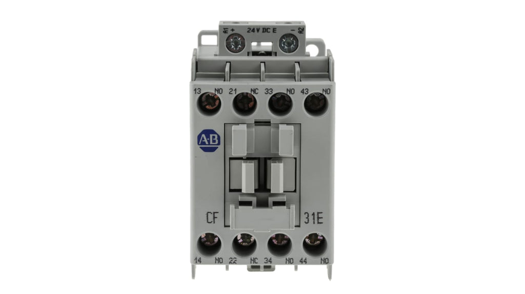Contattore Allen Bradley, 4 poli, 3NO + 1NC, corrente nominale 25 A, tensione nominale contatto 690 V c.a., tensione bobina 24 V c.c., montaggio su guida DIN, dimensioni 81mm x 45mm x 112.5mm, temperatura operativa da -25°C a +60°C, conforme a IEC 60947-5-1, materiali ecocompatibili, certificazioni CE, cULus, CCC.