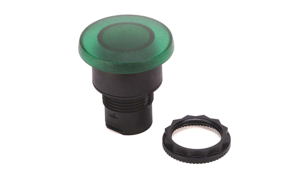 Attuatore pulsante tipo Instabile, rotondo, diametro 40 mm, colore verde, illuminato, grado di protezione IP65, foratura 22 mm, materiale plastica, serie 800F, progettato per il controllo di macchine. Standard CE, UL, CSA, CCC. Installazione a pannello semplice, attivazione momentanea, robustezza garantita da design modulare.
