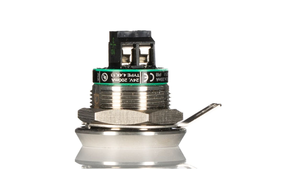 Pulsante piezoelettrico montaggio a pannello, configurazione SPST, diametro foro 22,5 mm, grado di protezione IP69K, corpo in acciaio inox 316, completamente sigillato, tensione massima 24 V cc, range di temperatura operativa -25 a +70 gradi Celsius, anello di montaggio incluso, resistenza chimica ECOLAB, conforme a UL508, CSA, marchio CE, EN IEC 60947. Codice produttore 800K-22FMN24X10.