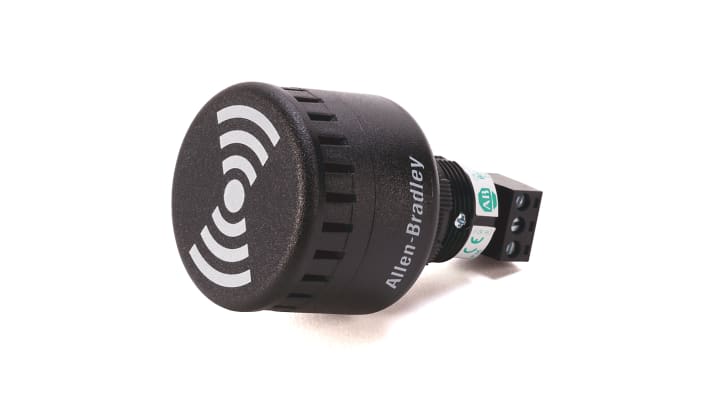 Sirena elettronica montaggio a pannello, tensione 240 V c.a., 105 dB a 1 m, diametro 65 mm, volume regolabile su 45 mm e 65 mm a meno di 85 dB, segnale continuo o intermittente selezionabile, grado di protezione IP65, temperatura operativa da -25 °C a +60 °C, peso 65 g, conforme a EN/IEC 60947-1, UL 508, CSA C22.2 n. 14, c-UL-us. Codice costruttore 855P-B20LE22.