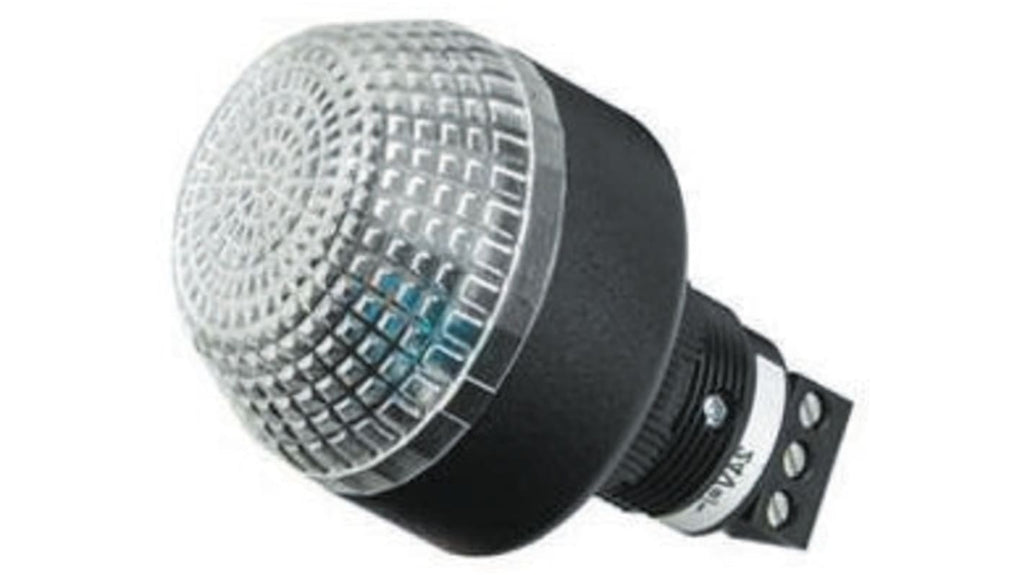 Segnalatore lampeggiante e fisso LED, montaggio a pannello da 22,5 mm, tensione di alimentazione 24 V ca/cc, effetto luce selezionabile statico o lampeggiante, grado di protezione IP65, diametro base 45 mm, altezza 72 mm, colore custodia nero, lente trasparente, lampada inclusa, temperatura operativa da -25 a +60 gradi Celsius, serie 855P, multifunzione.