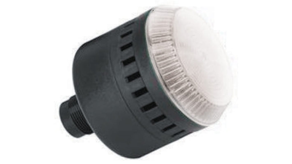 Segnalatore acustico e luminoso Allen Bradley serie 855PC, montaggio a pannello da 22,5 mm, tensione 240 V c.a., volume regolabile a 85 dB e 103 dB a 1 m, segnale continuo o intermittente, luce lampeggiante o fissa, grado di protezione IP65, temperatura operativa da -25°C a +60°C, custodia in policarbonato, colore nero, lente trasparente, tipo sirena elettronico, LED.