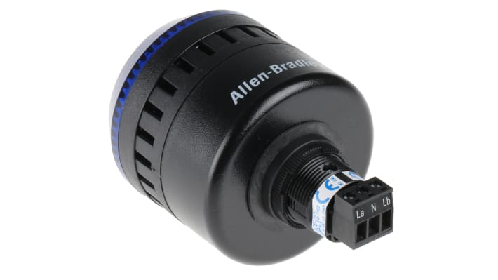 Segnalatore acustico e luminoso Allen Bradley serie 855PC, tensione 24 V c.a. / c.c., volume regolabile 85-103 dB, luce blu LED, montaggio a pannello, alloggiamento in policarbonato, grado di protezione IP65, temperatura operativa -25°C a +60°C, peso 85 g, conforme a cULus, CE, CSA C22.2 N. 14, EN/IEC 60947-1, EN/IEC 60947-5-1, UL 508.