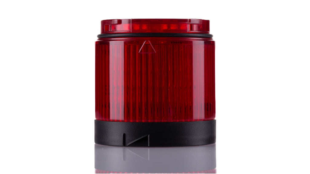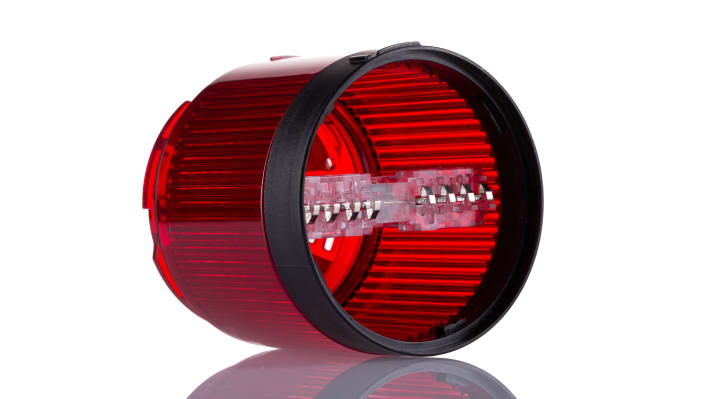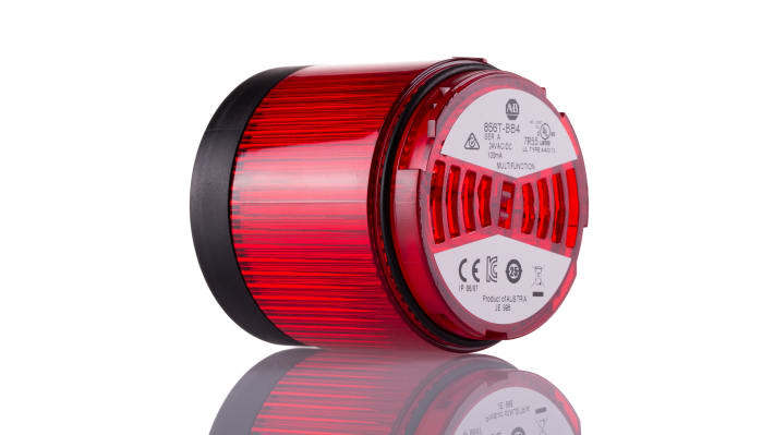 Torretta di segnalazione Allen Bradley, segnalatore luminoso multifunzione, LED rosso, tensione di alimentazione 24 V ca/cc, corrente 100 mA, altezza 77 mm, diametro base 70 mm, grado di protezione IP67, intervallo di temperatura operativa -30°C a +70°C, durata lampada oltre 40.000 ore, modalità di illuminazione: stabile, lampeggiante a 2 Hz, stroboscopico singolo e doppio a 1,4 Hz, colore custodia nero, conforme a CE e cULus.