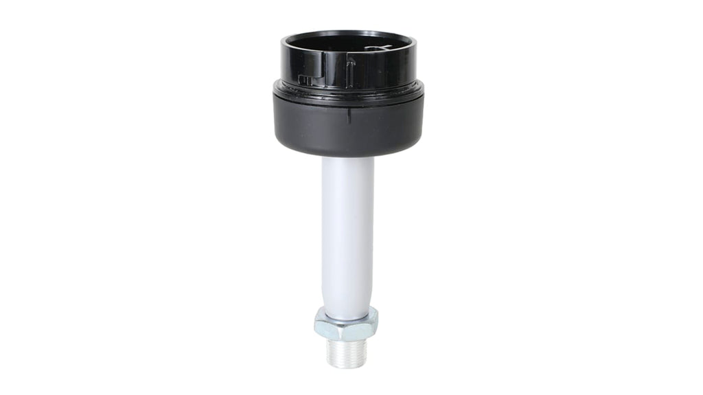 Base di montaggio per sistemi di segnalazione a torre di controllo, diametro base 70 mm, tubo filettato M20, lunghezza tubo 100 mm, tensione nominale 24 V c.c., intervallo di temperatura da -30 a +70 gradi Celsius, colore nero, stile di terminazione a vite, adattatore con blocco per segnalatori luminosi e cicalini, standard cULus, RoHS, CE.