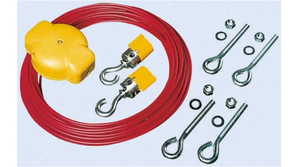 Kit di installazione per azionamento a distanza, compatibile con interruttore a fune 440E. Include 1 tenditore, 2 ganci, fune, bulloni ad occhiello, chiave esagonale. Sistema innovativo per messa in tensione della fune, installazione rapida. Disponibile in 7 lunghezze di fune, da 5m a 75m. Fune tensionata ruotando il bullone sul tenditore. Marchio Allen Bradley Guardmaster, codice 440E-A13085.