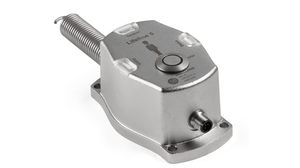 Interruttore a fune Allen Bradley Guardmaster, corrente massima 200 mA, tensione massima 24V, lunghezza cavo 100 m, montaggio Diritto, grado di protezione IP66, temperatura operativa da -20 a +75 gradi Celsius, custodia in acciaio inox, dimensioni 124 x 78 x 91 mm, conforme a standard IEC 60947-5-5, PLe Cat 4, EN ISO 13850, dotato di pulsante di arresto di emergenza e reset.