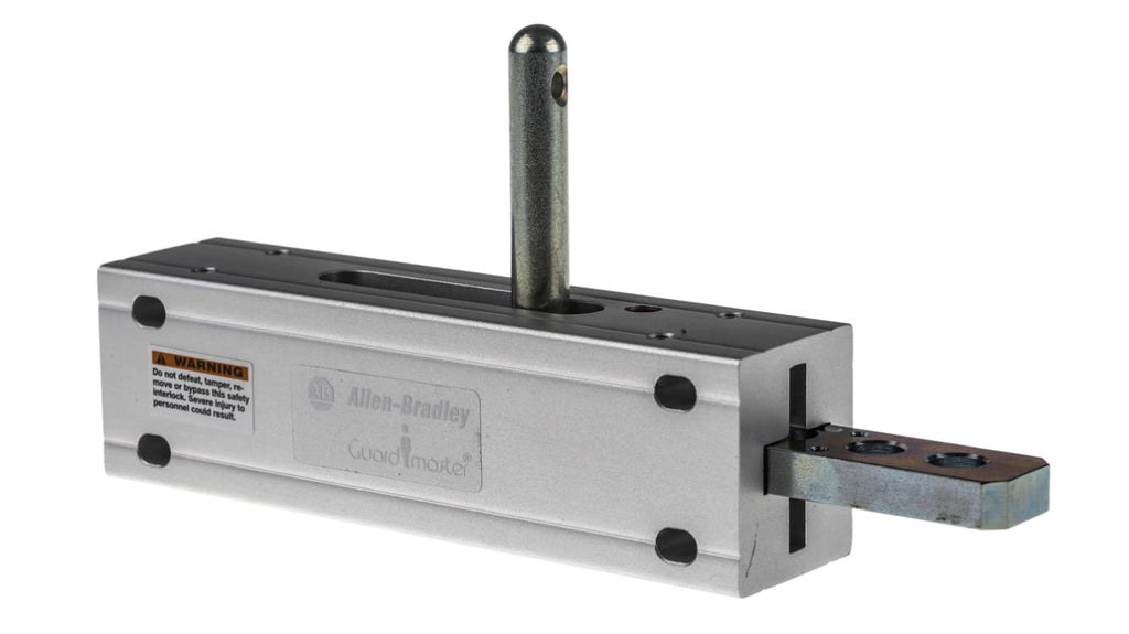 Attuatore con bullone scorrevole per interruttore di interblocco di sicurezza TLS-GD2, modello 440G-A27163, marchio Allen Bradley Guardmaster. Realizzato in acciaio inox, contenitore in alluminio, azionamento manuale, bloccabile con fino a 3 lucchetti. Dimensioni: 3,3 pollici (lunghezza) x 1,57 pollici (larghezza) x 5,51 pollici (altezza). Fissaggio permanente richiesto. Adatto per applicazioni industriali di sicurezza.