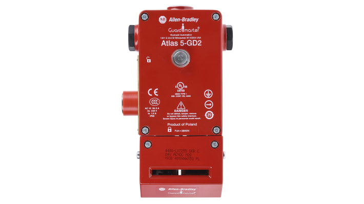 Interruttore di interblocco a solenoide per impieghi pesanti, tensione 24V ca/cc, grado di protezione IP65, contatti di sicurezza 2NC e contatto ausiliario 1NO, attuatore standard incluso, materiale custodia in lega pressofusa, temperatura di esercizio -10 a +60 gradi Celsius, dimensioni 184mm x 80mm x 56mm, potenza di sblocco, meccanismo di bloccaggio con forza fino a 5000N, certificazioni EN954-1, ISO13849-1, IEC/EN60204-1.