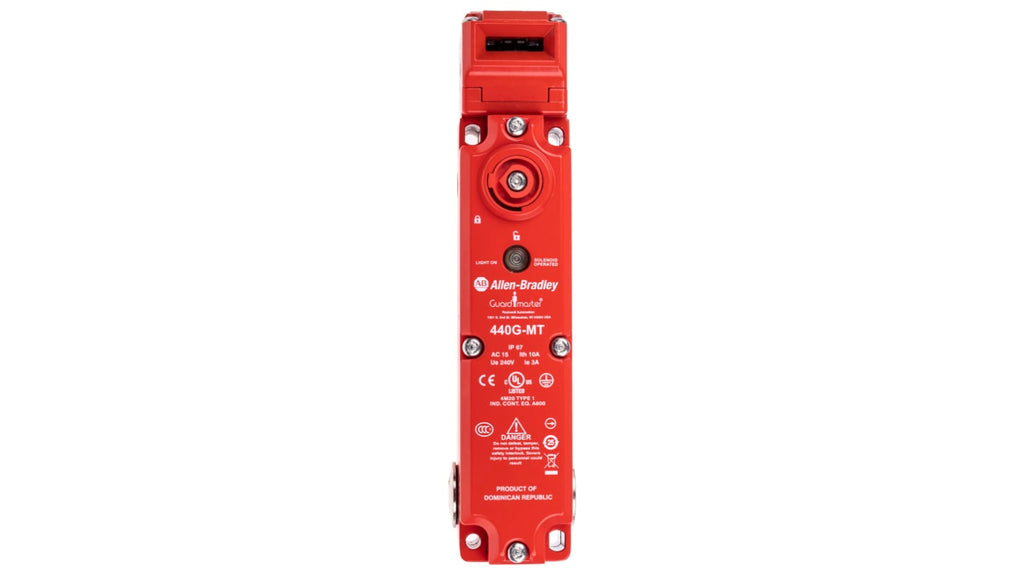 Interruttore di interblocco a solenoide per impieghi pesanti, tensione di alimentazione 24V ca/cc, potenza solenoide 13W, grado di protezione IP67, temperatura d'esercizio -25 a 60 gradi, forza di tenuta 1600N, corsa attuatore 15mm, contatti 3NC/1NO, ingresso cavo M20, dimensioni 46.75mm x 199mm x 40mm, materiale custodia metallo, conforme a norme EN954-1, ISO13849-1, IEC/EN60204-1, NFPA79, approvazione cULus, certificazione CE.