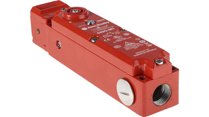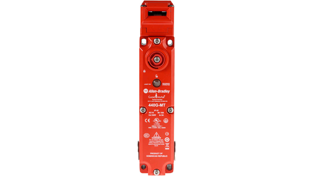 Interruttore di interblocco a solenoide Allen Bradley Guardmaster, modello 440G-MT47016, tensione 230V ca/cc, grado di protezione IP67, contatti di sicurezza 3NC e contatto ausiliario 1NO, ingresso cavo M20, materiale custodia in metallo, forza di bloccaggio 1500N, temperatura di esercizio da -25 a +60 gradi, dimensioni 46.75mm x 199mm x 40mm, azione Break-before-make, certificazioni CE, cULus, CSA, TUV.