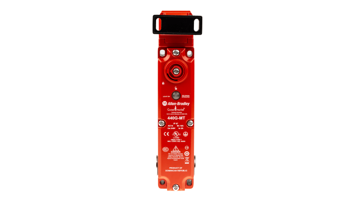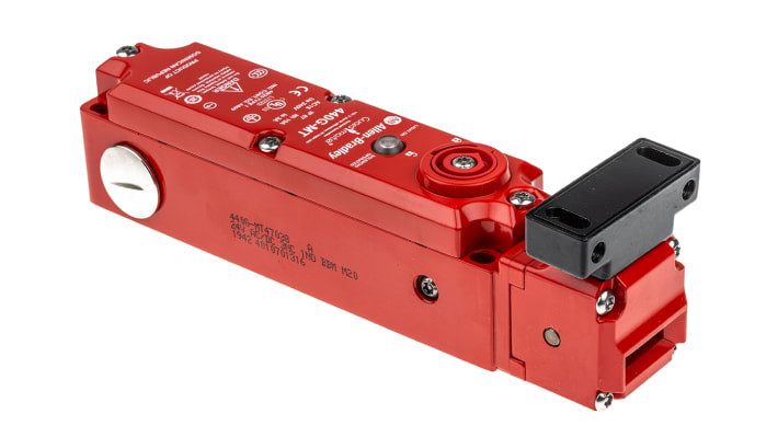 Interruttore di interblocco a solenoide, 24V ca/cc, IP67, modello 440G-MT47038. Contatti di sicurezza: 3 normalmente chiusi, 1 normalmente aperto. Attuatore flessibile in acciaio inox, custodia in lega di zinco verniciato. Dimensioni: 40mm x 199mm x 46.75mm. Grado di protezione IP67, ingresso cavo M20. Certificazioni: CE, cULus, CSA, TUV, conforme a EN954-1, ISO13849-1, IEC/EN60204-1. Forza di bloccaggio 1500N.