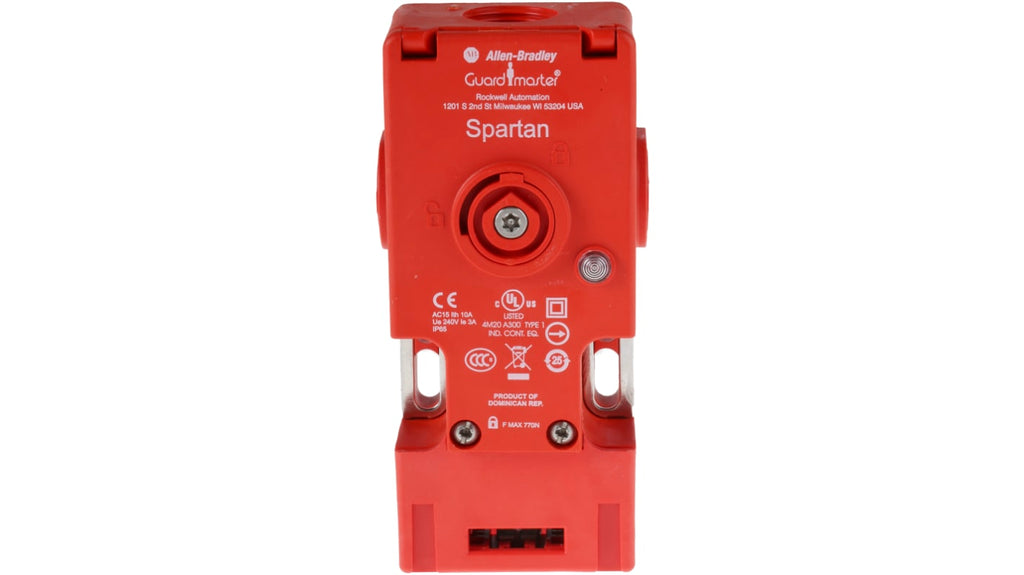 Interruttore di interblocco a solenoide Allen Bradley Guardmaster, modello 440G-S36001, tensione di alimentazione 24V ca/cc, grado di protezione IP67, contatti di sicurezza 2NC e contatto ausiliario 1NO. Dimensioni 58mm x 120mm x 35mm, materiale custodia in plastica rinforzata, attuatore standard incluso, ingresso cavo M20, temperatura operativa da -20 a 60 gradi Celsius. Certificazioni CE, cULus, CSA, TUV.