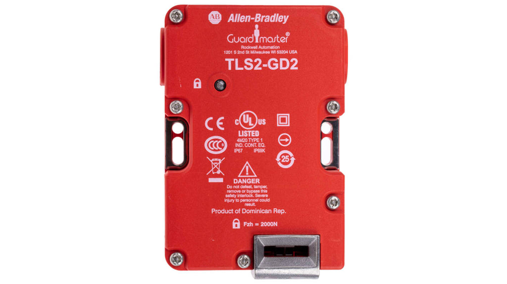 Interruttore di interblocco a solenoide, tensione di alimentazione 24V ca/cc, potenza di blocco, attuatore completamente flessibile incluso, contatti di sicurezza 2NC, contatti ausiliari 1NA, ingresso cavo M20, materiale custodia in plastica, temperatura d'esercizio da -20 a 60 gradi, grado di protezione IP66, IP67, IP69K, dimensioni 126mm x 86mm x 43mm, certificazioni EN954-1, ISO13849-1, IEC/EN60204-1, approvazione UL, certificazione CE.