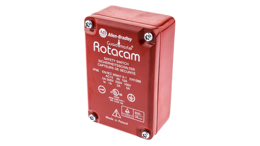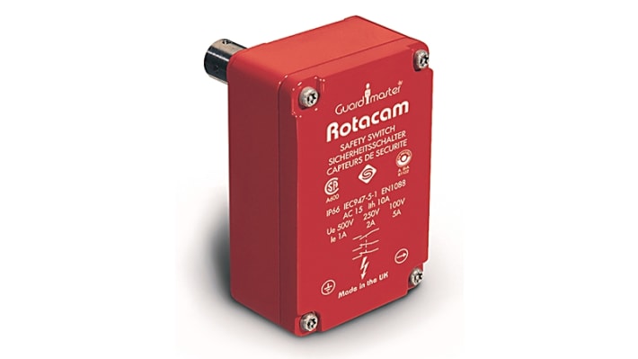 Interruttore a cerniera Allen Bradley Guardmaster, modello Rotacam, configurazione NA/2NC, tensione massima 600V c.a. e 24V c.c., lunghezza albero 85 mm. Contenitore in lega pressofusa, grado di protezione IP66, operante in un range di temperatura da -20 a +80 gradi. Contatti a guida forzata, conforme a EN 1088 e IEC 947-5-1. Camma regolabile per azionamento da 5 a 11 gradi. MTTFd oltre 385 anni. Codice costruttore 440H-R03079.
