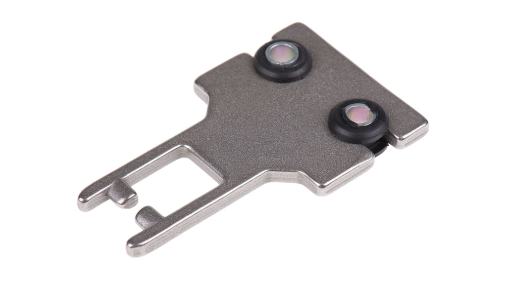 Attuatore piatto per interruttori di interblocco di sicurezza. Realizzato in acciaio inox, compatibile con interruttori Trojan, 440G-MT, TLSGD2, MT-GD2. Montaggio permanente su porte di protezione, supporta protezioni scorrevoli, incernierate e sollevabili. Include piccoli blocchi in gomma per gioco durante la chiusura. Codice costruttore 440K-A11112.