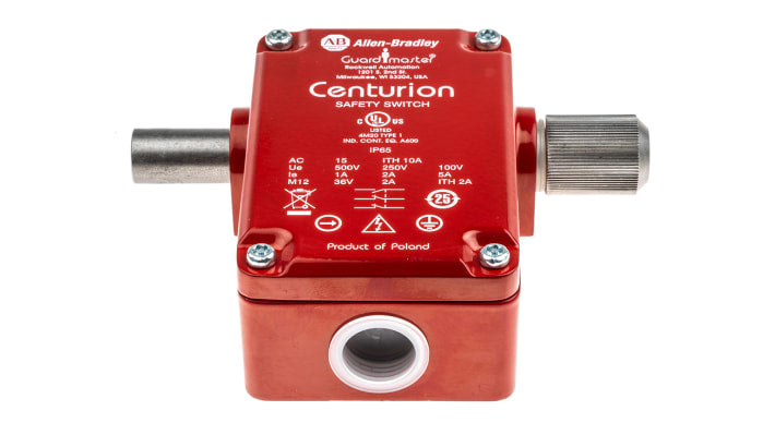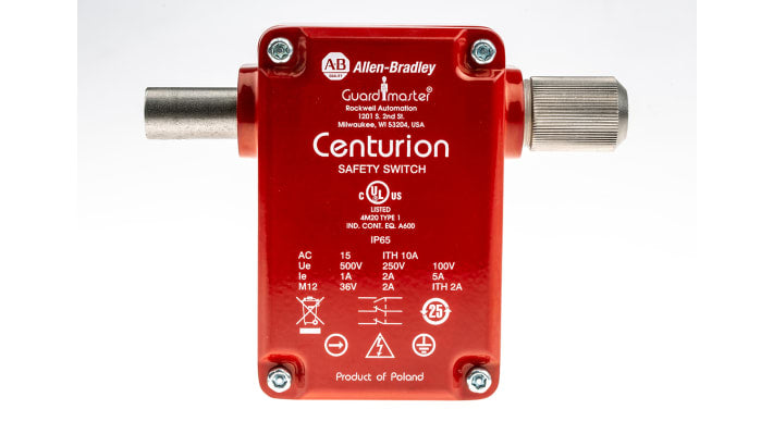 Interruttore di interblocco di sicurezza Allen Bradley Guardmaster, 2NC/1NA, con linguetta, bloccaggio a solenoide, grado di protezione IP66, tensione massima 600V, corrente massima 6A, attuatore incluso, materiale custodia in metallo, temperatura operativa da -25 a +80 gradi, dimensioni 64mm x 40.5mm x 98mm, certificazioni EN954-1, ISO13849-1, IEC/EN60204-1, NFPA79, EN1088, ISO14119, IEC/EN60947-5-1, approvazione cULus.