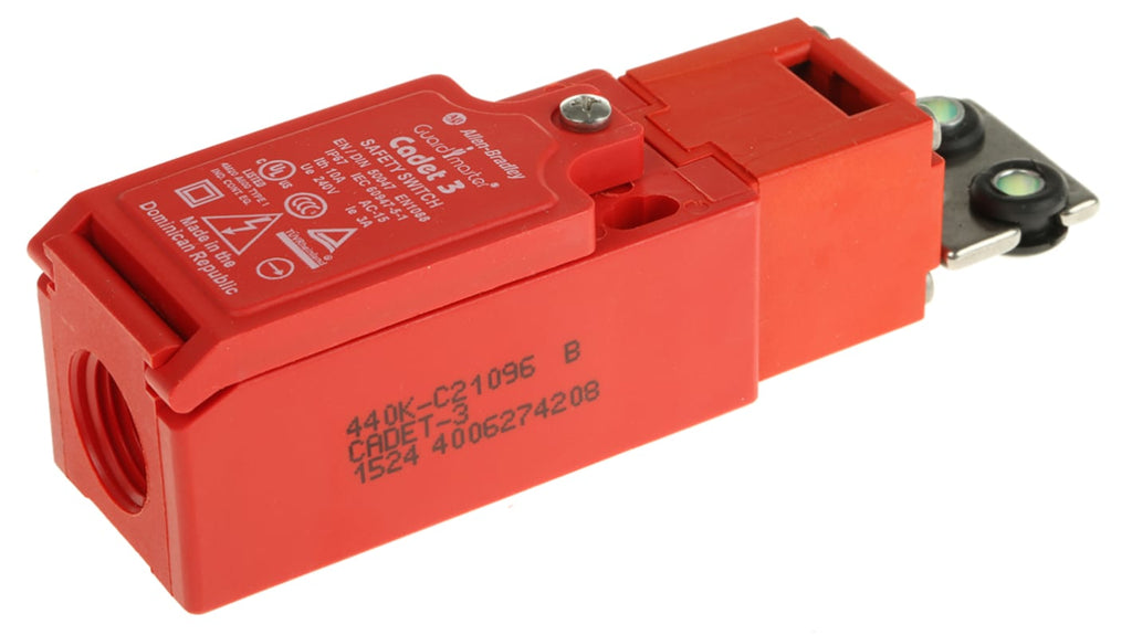 Interruttore di interblocco di sicurezza Allen Bradley Guardmaster, modello 440K-C21096, con 3 contatti NC, azionamento a chiave, grado di protezione IP67, tensione massima 600V, corrente massima 2,2A. Attuatore incluso, configurazione con 8 direzioni di ingresso, materiale custodia in PBT rinforzato con fibra di vetro. Range di temperatura operativa da -20 a +80 gradi Celsius. Conforme a norme EN 1088 e IEC 947-5-1. Dimensioni: 90,5mm x 31mm x 30,4mm.