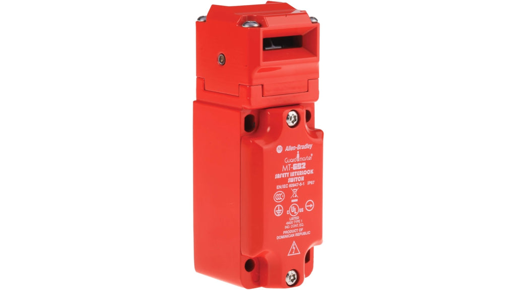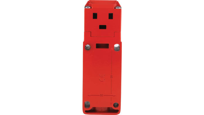 Interruttore di interblocco di sicurezza, 2NC/1NA, a chiave, tensione massima 500V AC/250V DC, corrente massima 2,2A, grado di protezione IP67, custodia in lega di zinco verniciata rossa, temperatura operativa da -20 a +80 gradi, connessione M20, testa girevole con 8 opzioni di ingresso attuatore, conforme a EN 1088 e IEC 947-5-1, certificazione CE, registrazione UL, certificazione TUV. Dimensioni: 40.7mm x 40mm x 116.5mm.