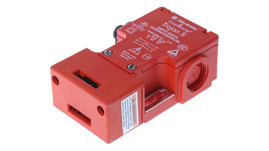 Interruttore di interblocco di sicurezza a chiave Allen Bradley Guardmaster, 2NC/1NA, tensione massima 500V AC e 250V DC, corrente massima 2,2A, grado di protezione IP67, materiale custodia PBT rinforzato con fibra di vetro, attuatore antimanomissione, configurazione con 4 direzioni della testa, tipo di connessione M20, dimensioni 32mm x 52mm x 95mm, temperatura operativa da -20°C a +80°C, conforme a EN 954-1 e altre normative.