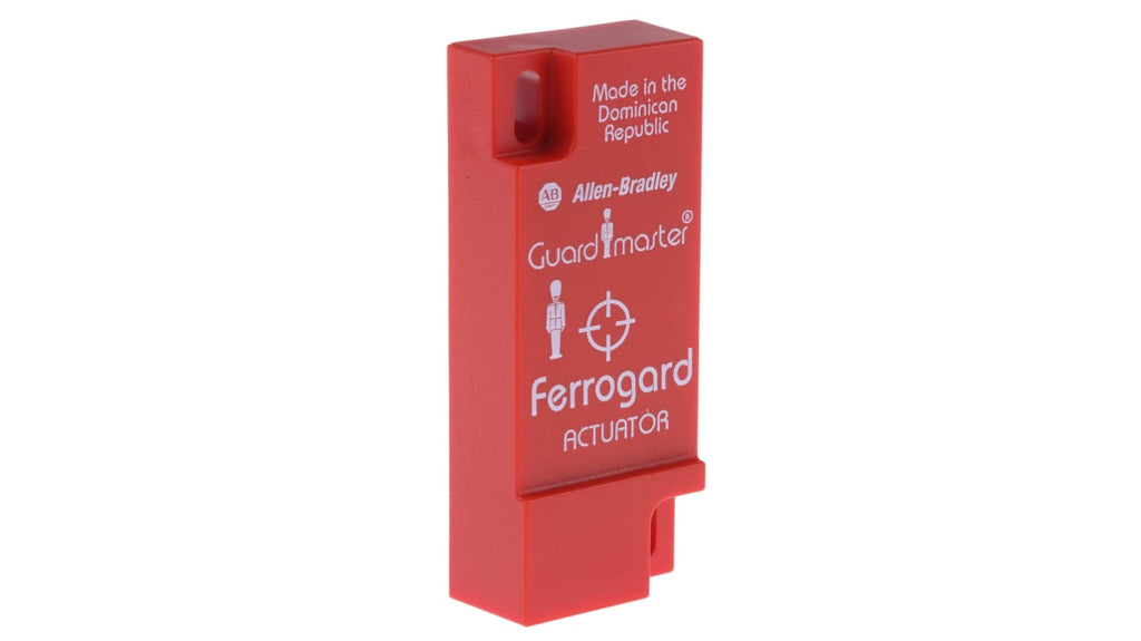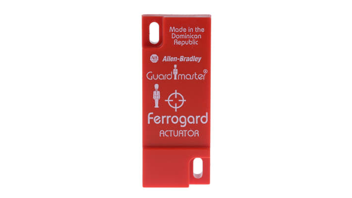 Interruttore di sicurezza senza contatto Allen Bradley Guardmaster, attuatore magnetico per interruttori Ferrogard 1, 2, 3, 4, 5, 20 e 21, materiale ABS, protezione IP67, distanza di commutazione 12 mm, dimensioni 37 mm x 15 mm, montaggio M4, sigillato per ambienti di lavaggio, conforme a EN954-1, ISO13849-1, IEC/EN60204-1, NFPA79, EN1088, ISO14119, ANSI B11.19, AS4024.1, certificazione CE, omologazione cULus.