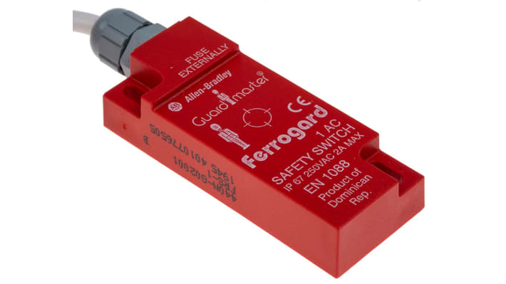 Interruttore di interblocco senza contatto Ferrogard, tensione 250V ca, corrente 2A max, contatti di sicurezza NC, cavo da 2 m, attuatore magnetico incluso, grado di protezione IP67, materiale custodia plastica, dimensioni 76mm x 30mm x 15mm, distanza di commutazione 12mm, montaggio M4, conforme a EN954-1, ISO13849-1, IEC/EN60204-1, NFPA79, EN1088, ISO14119, ANSI B11.19, AS4024.1.