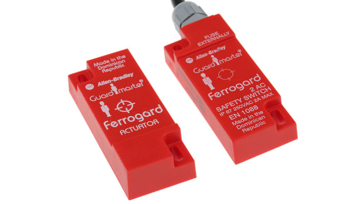 Interruttore di sicurezza magnetico senza contatto, tensione di alimentazione 250V ca, contatti di sicurezza NC, contatti ausiliari NA, cavo 4m, attuatore magnetico incluso, materiale custodia plastica ABS, protezione IP67, distanza di commutazione 12mm, dimensioni 76mm x 30mm x 15mm, categoria di sicurezza 1, conforme a EN954-1, ISO13849-1, IEC/EN60204-1, NFPA79, EN1088, ISO14119, ANSI B11.19, AS4024.1, certificazione CE, registrazione UL.