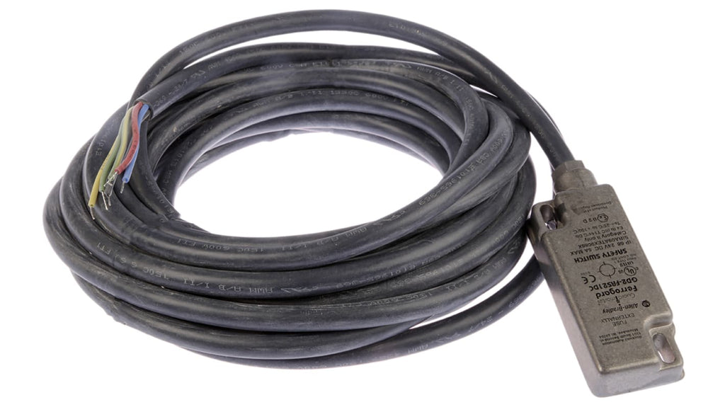 Interruttore di sicurezza magnetico senza contatto, tensione di alimentazione 24V cc, corrente 1000mA, contatti di sicurezza 2NC, contatto ausiliario 1NO, cavo da 6 m incluso, custodia in acciaio inox, protezione IP68, distanza di commutazione 12 mm, temperatura operativa da -25 a 125 gradi Celsius, conforme a EN954-1, ISO13849-1, IEC/EN60204-1, certificazione CE, registrazione UL. Dimensioni: 78.5 mm x 33.5 mm x 16 mm.