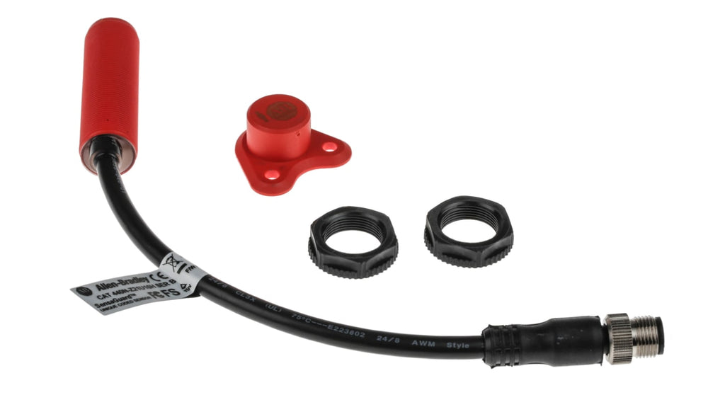 Interruttore di sicurezza cilindrico senza contatto RFID, tensione 24V cc, custodia in plastica, attuatore incluso, distanza di commutazione 15 mm, grado di protezione IP69K, dimensioni 67.06 mm di lunghezza e 18 mm di diametro, categoria di sicurezza 4, conforme a IEC60947-5-3, IEC 61508, EN954. Dotato di 3 uscite PNP, indicazione LED per diagnostica, compatibile con Guardlink.