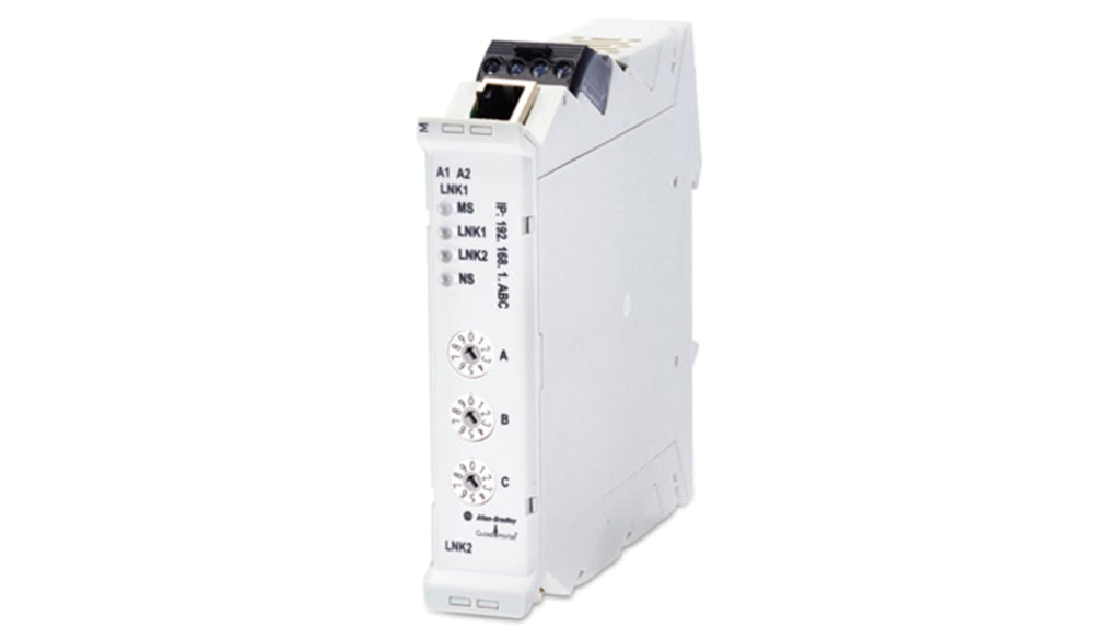 Modulo d'interfaccia per relè di sicurezza Guardmaster GSR, tensione di alimentazione 24 V c.c., interfaccia Ethernet, montaggio su guida DIN, dimensioni 111,4 x 22,5 x 113,6 mm. Supporta fino a sei relè su una singola interfaccia, diagnostica in tempo reale, tecnologia con collegamenti ottici, conforme ai requisiti ODVA per reti EtherNet/IP. Profilo add-on completo in Logix Designer, senza necessità di programmazione.