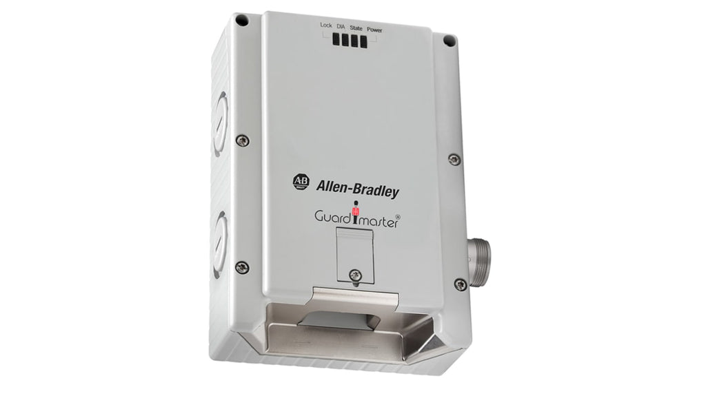 Interruttore di interblocco a solenoide, tensione di alimentazione 5-24V cc, protezione IP65, attuatore con codifica RFID, forza di tenuta 2000 N, consumo energetico 250 mW, ingresso cavo M23, materiale custodia in plastica rinforzata con fibra di vetro, dimensioni 285.3 mm x 114 mm x 174 mm, dotato di quattro LED per stato e diagnostica, uscite per posizione sportello e stato di blocco.