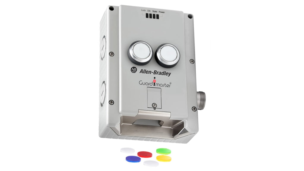 Interruttore di interblocco a solenoide, tensione di alimentazione 5-24V cc, potenza di blocco 250mW, attuatore con codifica RFID, connessione M23, custodia in plastica rinforzata con fibra di vetro, grado di protezione IP65, forza di tenuta 2000 N, dimensioni 285.3mm x 114mm x 174mm, quattro LED per stato e diagnostica, uscite per posizione sportello e stato di blocco, due occhielli per lucchetti.