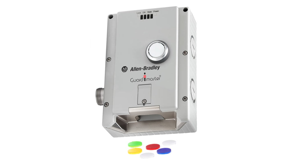 Interruttore di interblocco a solenoide, tensione di alimentazione 5-24V cc, protezione IP65, attuatore con codifica RFID, forza di tenuta 2000 N, consumo energetico 250 mW, ingresso cavo M23, materiale custodia plastica rinforzata con fibra di vetro, dimensioni 285.3 mm x 174 mm x 114 mm, dotato di quattro LED per stato e diagnostica, uscite per posizione sportello e stato di blocco, due occhielli per lucchetti.