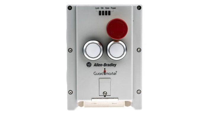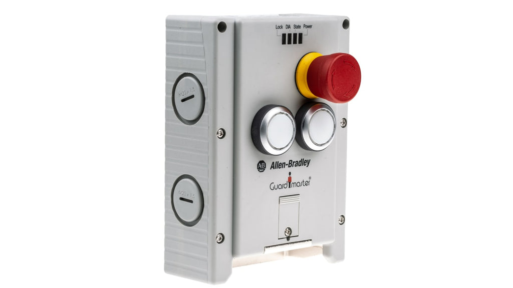 Interruttore di interblocco a solenoide, tensione di alimentazione 5 a 24V cc, potenza di sblocco 250mW, attuatore incluso con codifica RFID, ingresso cavo M20, materiale custodia plastica rinforzata con fibra di vetro, grado di protezione IP65, dimensioni 114mm x 285.3mm x 113.9mm, compatibile con collegamenti a dispositivi esterni, quattro LED per segnalazione stato, pulsante di arresto di emergenza.