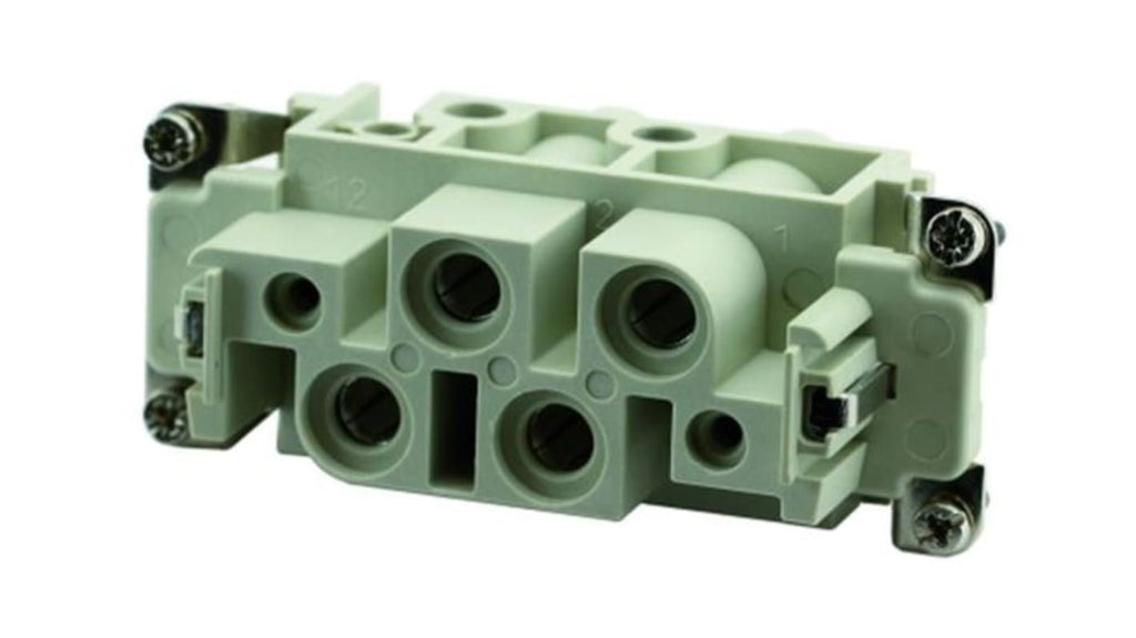 Inserto connettore femmina Amphenol Industrial, serie Heavy Mate C146, 4 posizioni + PE, corrente nominale 80 A, tensione nominale 830 V, gamma di temperatura da -40 a +125 gradi Celsius, materiale contatto CuZn, placcatura contatto in argento. Progettato per utilizzo con connettori industriali. Codice costruttore C146 10B004 100 13.