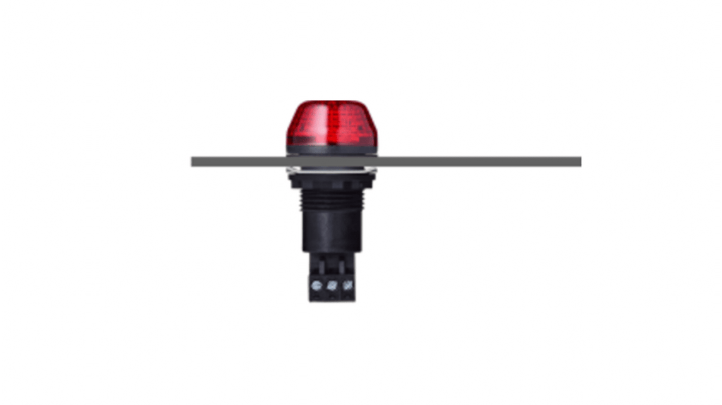 Segnalatore LED lampeggiante/fisso. Tensione di alimentazione 12 V c.a./c.c., effetto luce lampeggiante e fisso, colore lente rosso, montaggio su base e a pannello, tipo lampadina LED, diametro base 30 mm, serie IBS, grado di protezione IP 65, tecnologia di connessione intuitiva, contenitore nero, adattatore disponibile per pannelli M30,5 mm.