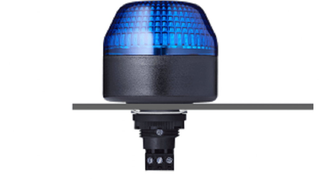 Segnalatore LED lampeggiante e fisso per montaggio a pannello, tensione di alimentazione 230-240 V CA, effetto luce lampeggiante e fisso, colore lente blu, tipo di lampadina LED, diametro base 65 mm, grado di protezione IP65, serie IBL, tecnologia di connessione intuitiva, adatto per applicazioni industriali e generiche.