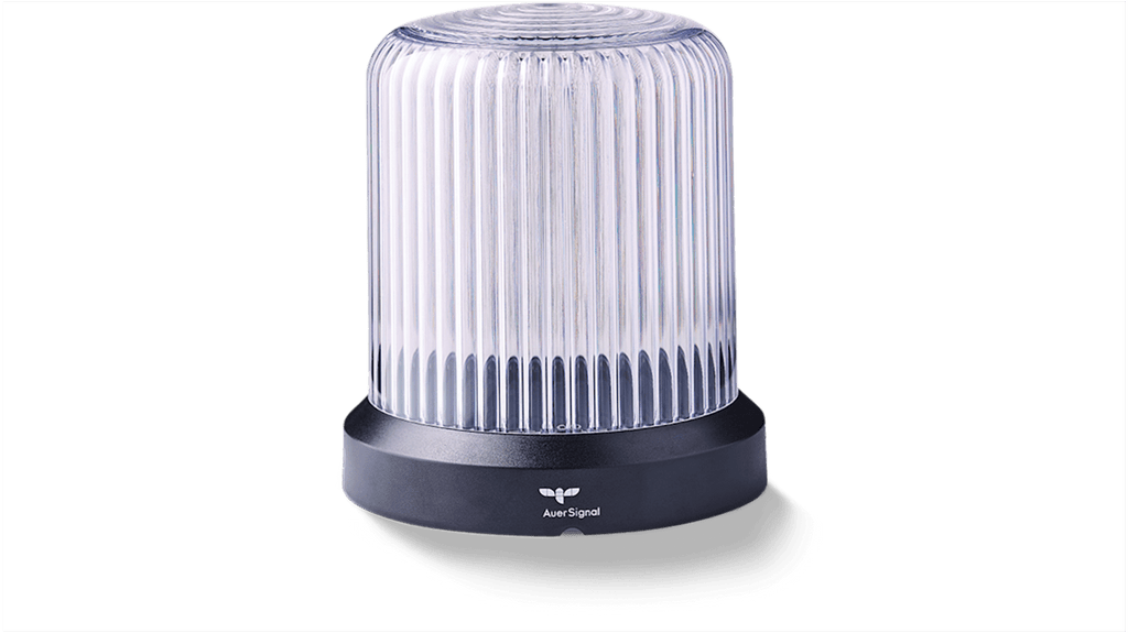 Segnalatore LED multifunzione AUER Signal RDMHP, tensione di alimentazione 110-240 V CA, temperatura d'esercizio -30 °C a +60 °C, grado di protezione IP66, resistenza agli urti IK08, lenti trasparenti, 7 funzioni di illuminazione controllabili esternamente, 15 modalità di funzionamento in 4 gruppi, diametro base 110 mm, design esclusivo.