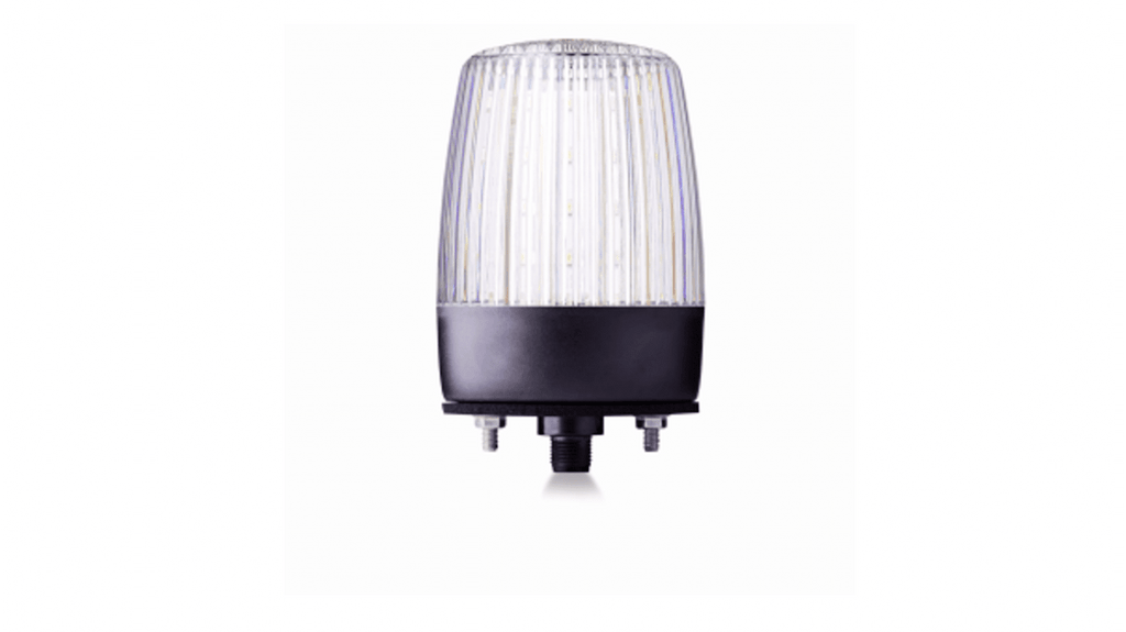 Segnalatore LED a tre colori AUER Signal, tensione 24 V c.a./c.c., effetto luce lampeggiante, rotante, fisso, stroboscopico, lente trasparente, grado di protezione IP67/IP69, resistenza agli urti IK08, temperatura d'esercizio -30 °C a +60 °C, connettore integrato M12 a 5 pin, montaggio orizzontale, su tubo o verticale, diametro base 75 mm, viti di fissaggio in acciaio inox.