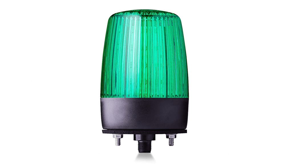 Segnalatore luminoso a LED multifunzione, tensione 24 V c.a./c.c., effetto luce lampeggiante, rotante, fisso, stroboscopico, colore lente verde, montaggio orizzontale, su tubo o verticale, diametro base 75 mm, serie PDMC5, grado di protezione IP67/IP69, resistenza agli urti IK08, temperatura d'esercizio -30 °C/+60 °C, connettore integrato M12 a 5 pin, viti di fissaggio in acciaio inox.