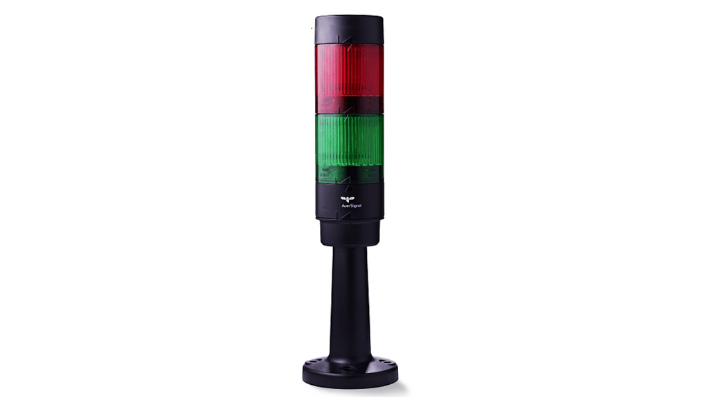 Torretta di segnalazione modulare, 24 V c.c., 2 elementi luminosi, lenti Verde e Rosso, LED, montaggio su tubo o NPT da 1/2 poll. Grado di protezione IP65, resistenza agli urti IK07, temperatura d'esercizio -30 °C a +60 °C, volume 95 dB, design esterno liscio, fino a 5 posizioni, moduli di luce continua e multifunzione, 8 toni selezionabili. Alloggiamento nero.