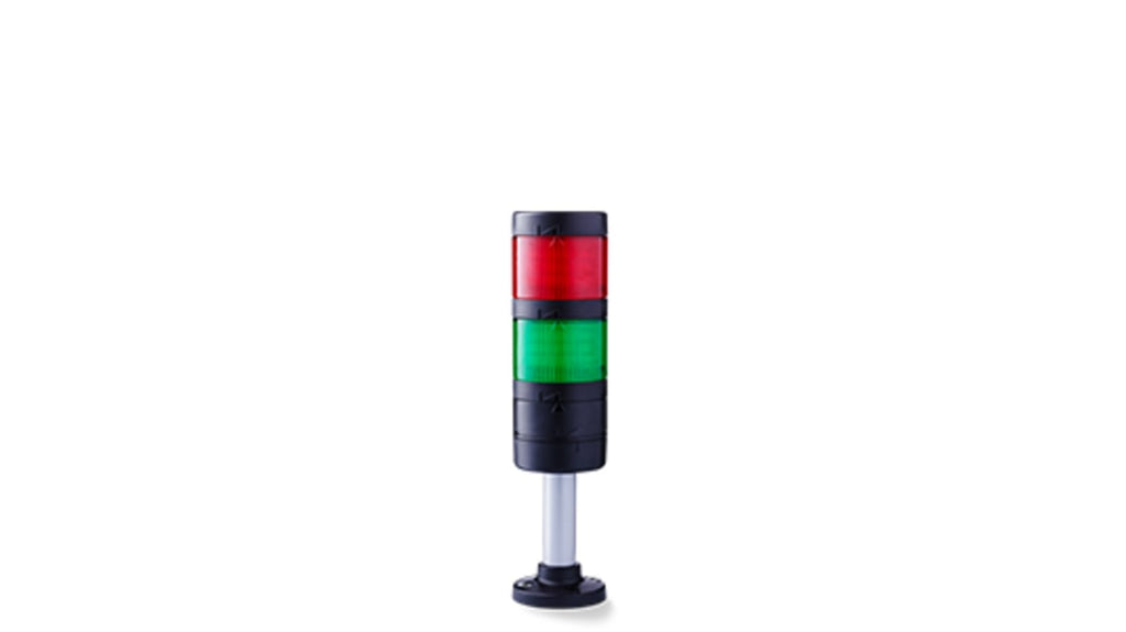 Torretta di segnalazione modulare, 70 mm, contenitore in policarbonato nero, temperatura d'esercizio -30 °C a +60 °C, tensione nominale 24 V c.a./c.c., 2 elementi luminosi, lenti verdi e rosse, LED, effetto luce fisso, grado di protezione IP66 e IP67, resistenza agli urti IK08, fino a 6 volte più luminoso rispetto a torrette comparabili, 7 posizioni per massima flessibilità.
