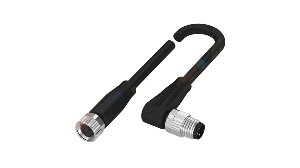 Cavo sensore/attuatore Balluff, 3 conduttori, M8 Femmina dritto e M8 Maschio ad angolo, lunghezza 1 m, guaina in PUR nero, temperatura operativa da -50 °C a 90 °C (routing fisso), da -25 °C a 90 °C (routing flessibile), tensione d'esercizio 60 VCC/VCA, grado di protezione IP67 e IP69K, approvazioni CE, cULus, EAC, WEEE.