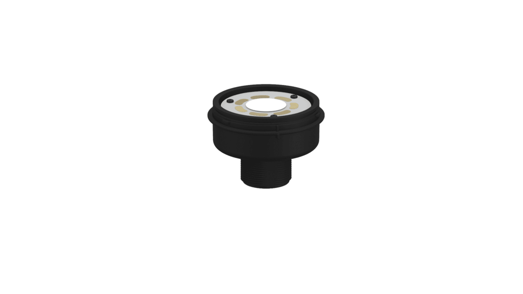 Torretta di segnalazione LED, 12-30 V c.c., altezza 47.5 mm, diametro base 70 mm, grado di protezione IP65, temperatura operativa da -40 a +50 gradi Celsius, contenitore nero resistente all'acqua e ai raggi UV, modularità per personalizzazione luci, fino a sei colori o cinque colori più segnale acustico, opzioni di collegamento M12, cablato e terminale a filo.