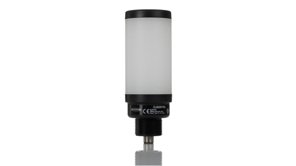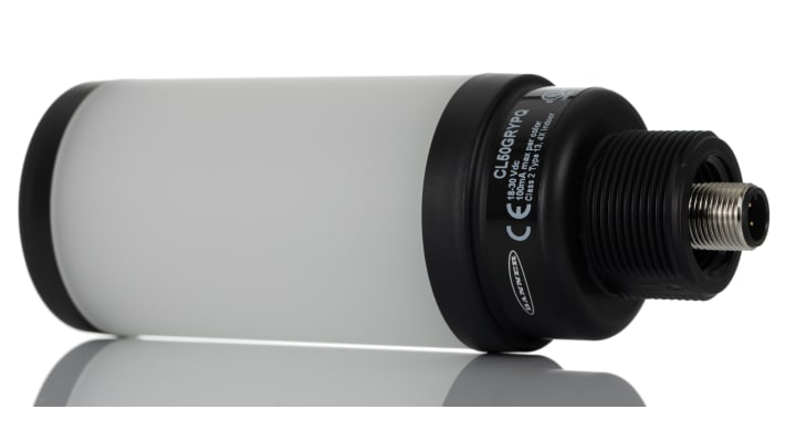 Torretta di segnalazione LED, 18-30 V c.c., 3 elementi luminosi Rosso/Verde/Giallo, consumo di corrente 100 mA per colore, diametro base 50 mm, altezza 114.2 mm, grado di protezione IP67, temperatura operativa da -40 a +50 gradi Celsius, montaggio versatile, tipo di connessione disinserimento rapido integrato, colore custodia nero. Serie CL50, codice costruttore CL50GRYPQ.