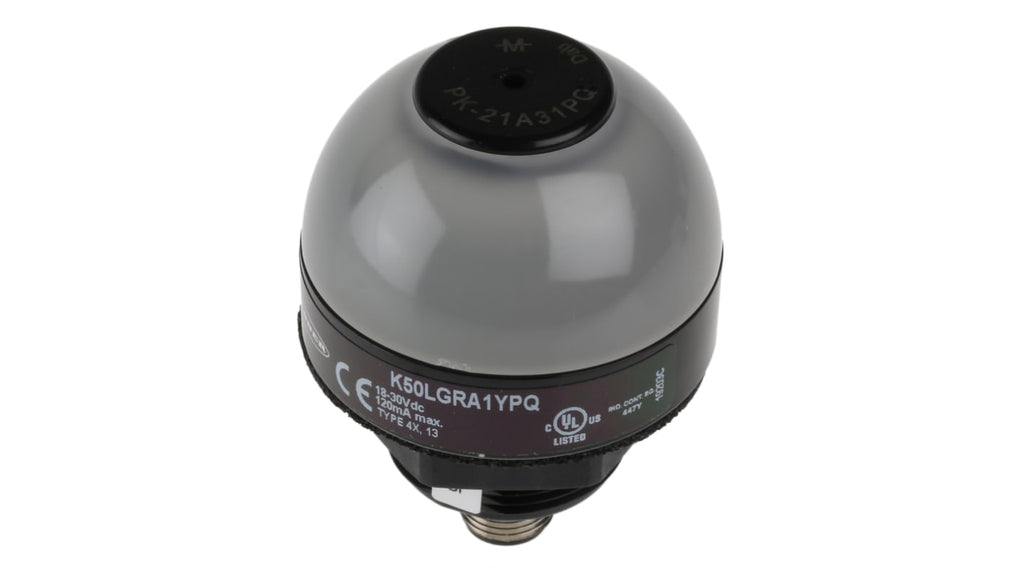 Segnalatore acustico e luminoso, tipo a lampadina LED, tensione 18-30 V c.c., uscita acustica 75 dB a 1 m, grado di protezione IP50, temperatura operativa -20°C/+50°C, montaggio su base, colore custodia nero, colori luce verde, rosso, giallo, elettronico, certificazione CE, omologazione cULus, corrente nominale 40 mA, tempo di risposta massimo 10 ms, numero di toni 1.