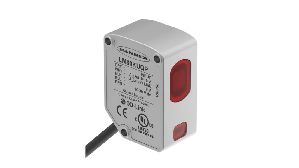 Sensore di distanza rettangolare a soppressione di sfondo, rilevamento 40-80 mm, uscita analogica 0-10 V, risoluzione 0,002-0,004 mm, tempo di risposta 0,25 ms, connettore M12, protocollo IO-Link, acciaio inox IP67, temperatura operativa da -10 a +55 gradi, montaggio piatto, sorgente di luce laser rosso.