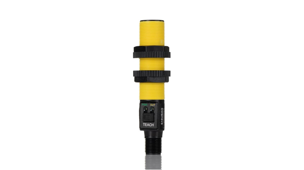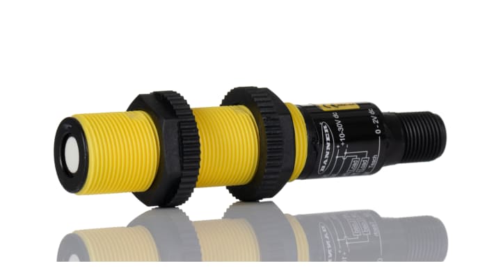 Sensore di prossimità cilindrico, tecnologia a ultrasuoni, filettatura M18 x 1, uscita PNP e NPN, gamma di rilevamento da 30 a 300 mm, frequenza di commutazione 100 Hz, grado di protezione IP67, temperatura operativa da -20 a +60 gradi Celsius, custodia in PBT, connettore M12 a 5 pin, protezione da inversione di polarità e cortocircuiti, lunghezza 90,9 mm. Codice costruttore S18UBAQ, marchio Banner.
